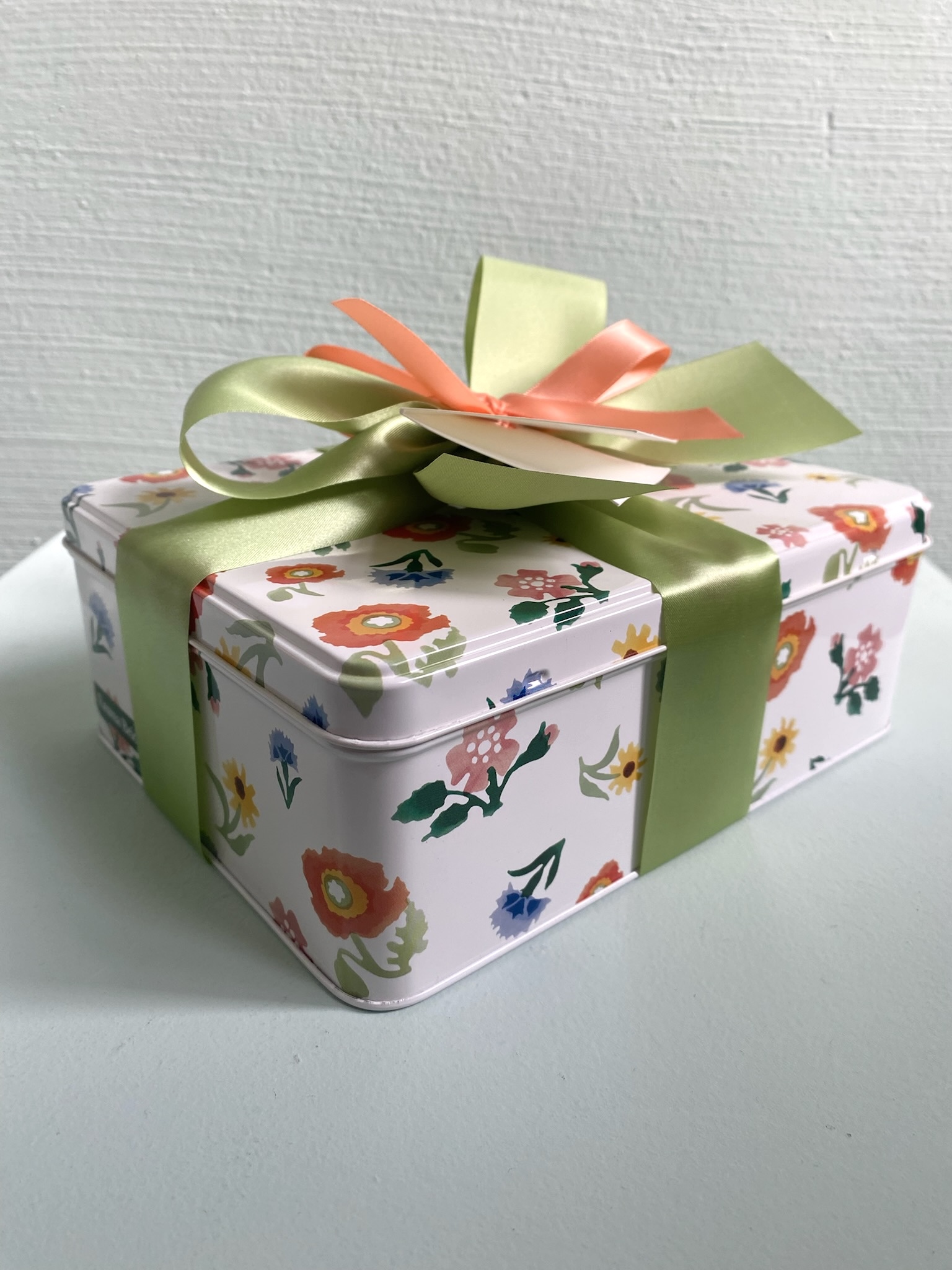 Deze stevige blikken doos bestaat in 10 uitvoeringen. Kies je print en wij vullen ze met 2 lagen lekkers.